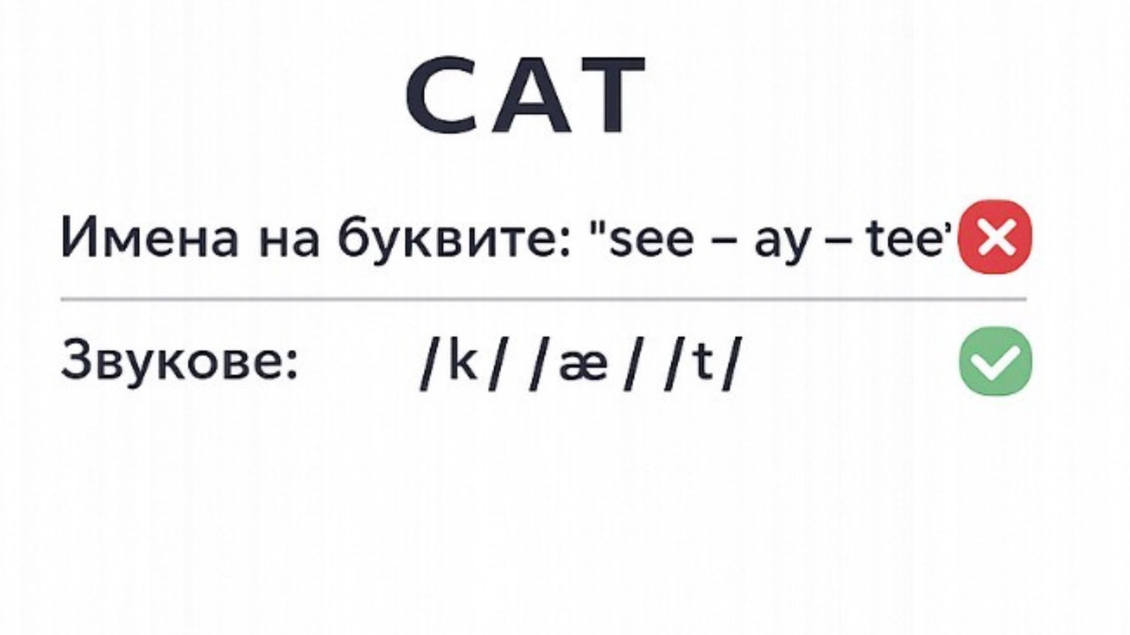Често обяснявам това на родителите с един прост пример. Показваме на детето картинка на котка и казваме: „Това е котка.“ Но ако го попитаме какъв звук издава, то казва „мяу“. Същото объркване се получава и при буквите. Детето може да знае, че буквата се казва „си – /c/“, но това не означава, че автоматично свързва тази буква със звука /k/ в дума като cat.